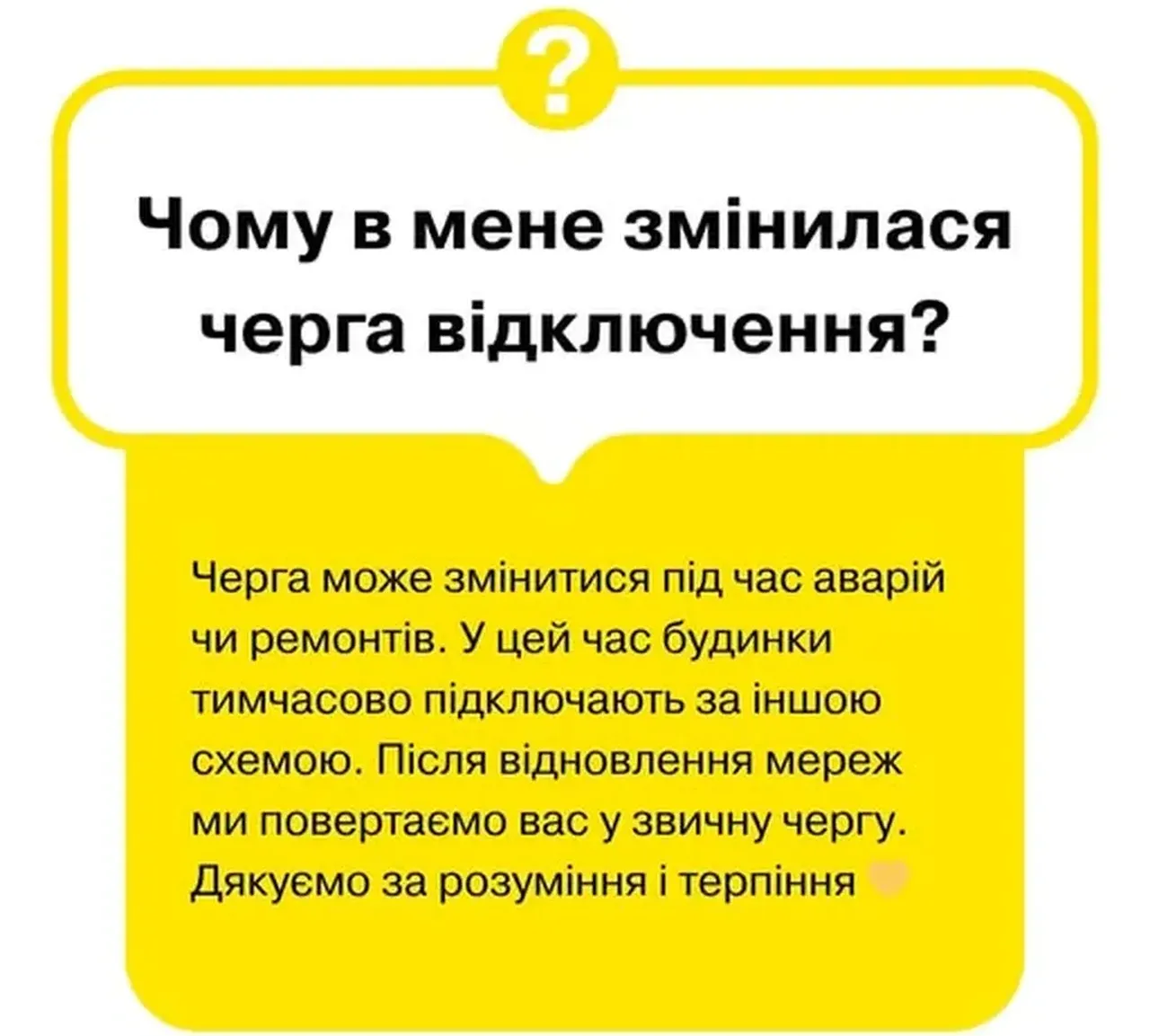Согласно разъяснению ДТЭК, причина изменений – аварийные ситуации или ремонтные работы. В таких случаях дома временно подключают по альтернативной схеме, а после восстановления сетей возвращают потребителей к обычному графику.
