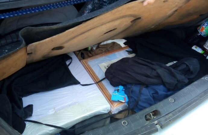 В багажнике пограничники нашли флаги с символикой РФ и СССР, картины с изображением Путина, наклейки, медали, картинки с изображением российской военной техники и крупную сумму в иностранной валюте.