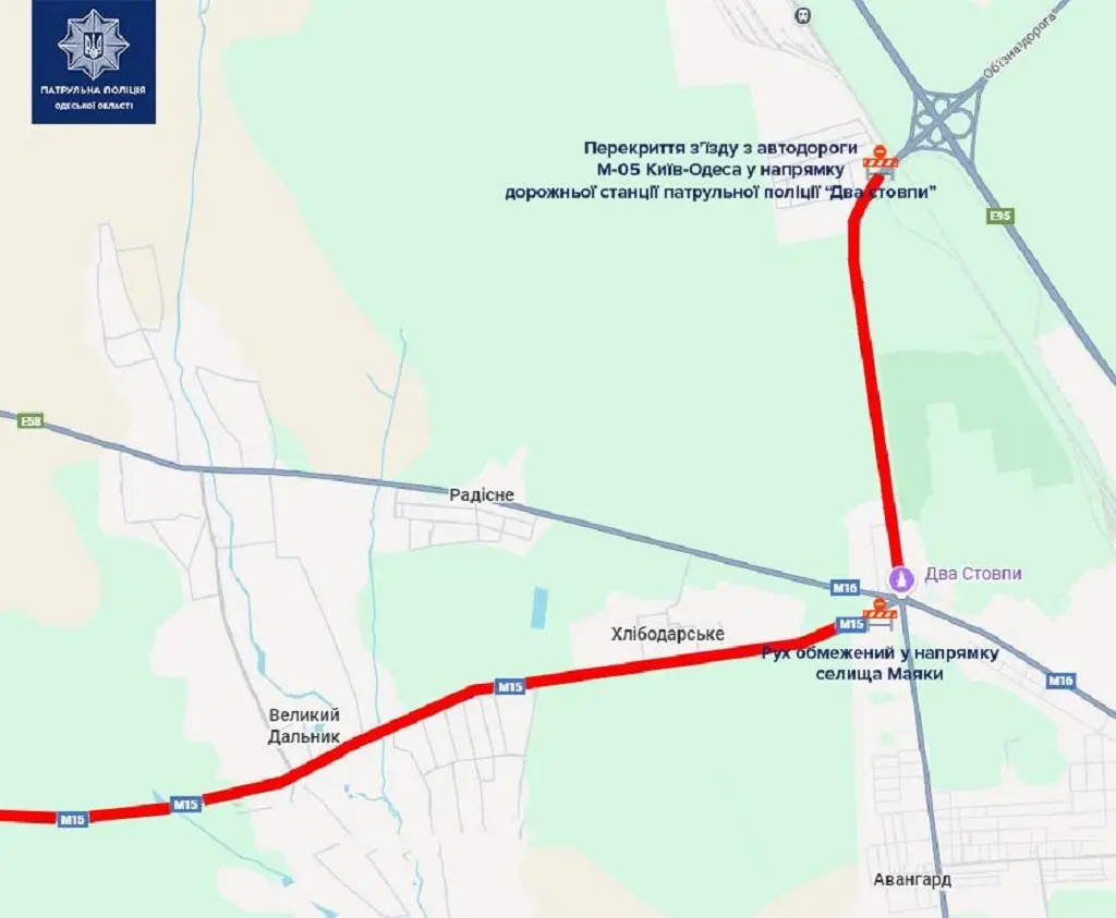 По данным Патрульной полиции Одесской области, ограничено движение транспорта на автомобильной дороге М-15 (от дорожной станции патрульной полиции «Два Столба» в направлении села Маяки).