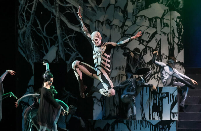 Хореографическую линию Кощея постановщик поменял полностью. В предыдущей версии их было двое – один у другого на шее сидел. Сейчас на закорках никто не ездит, но партию сказочного злодея все же исполняют двое танцовщиков. Одному справиться сложно, считает заведующий балетной труппой театра Гарри Севоян, — ведь владыка нечистой силы все время в движении, в прыжке. И коварные Кощеи – Павел Гриц и Денис Черняк – стелятся-крадутся за влюбленными, в гротескном изломе взлетают меж золотыми яблоками, в вихре нечисти нависают гибельным идолом над отважным Иваном-царевичем.