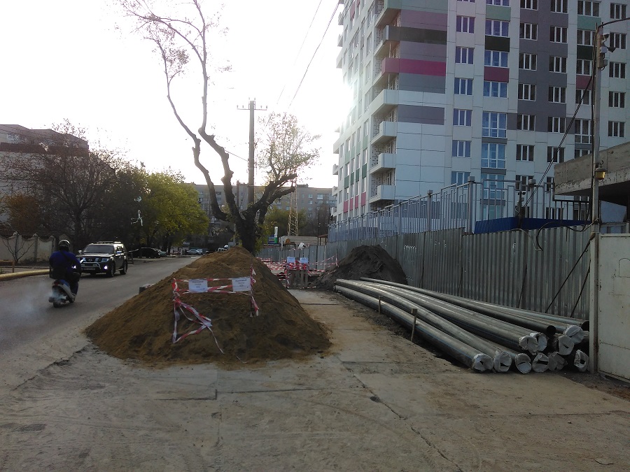 Сейчас работы начаты только на тротуаре по обеим сторонам Люстдорфской дороги. Однако на место уже доставлены трубы. Вероятно, также планируется подключение к городским коммуникациям новостроя на углу Люстдорфской и Костанди, раскопки возле которого ведутся уже около месяца.
