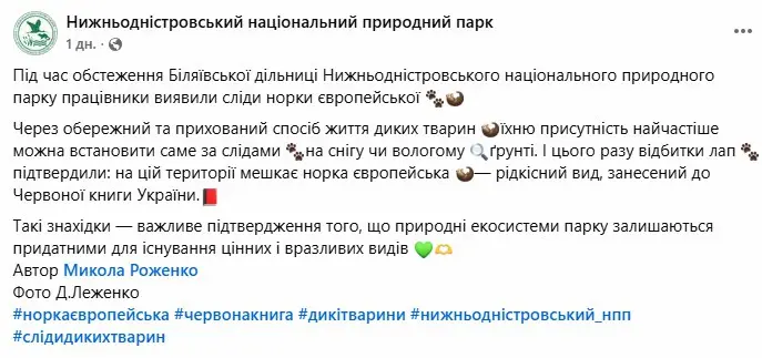 В Нижнеднестровский национальный природный парк зафиксировали следы норки европейской — мелкого хищника, обитающего у водоемов. Что это означает для экосистем региона?
