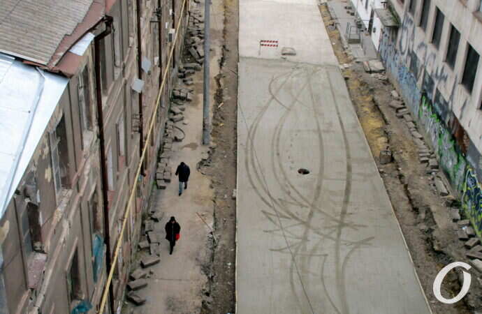 По бокам спуска красуется снятое покрытие, в том числе и брусчатка.