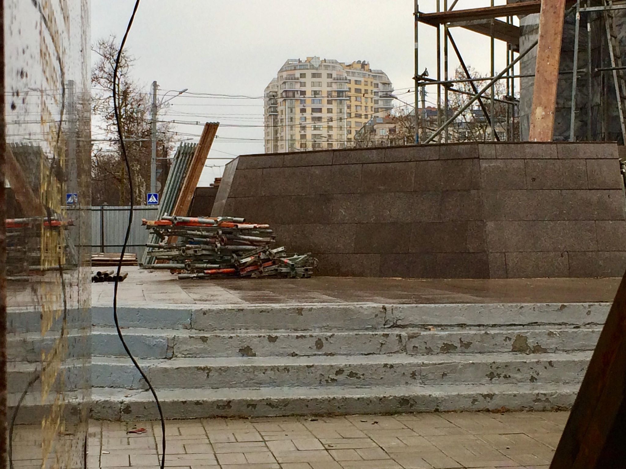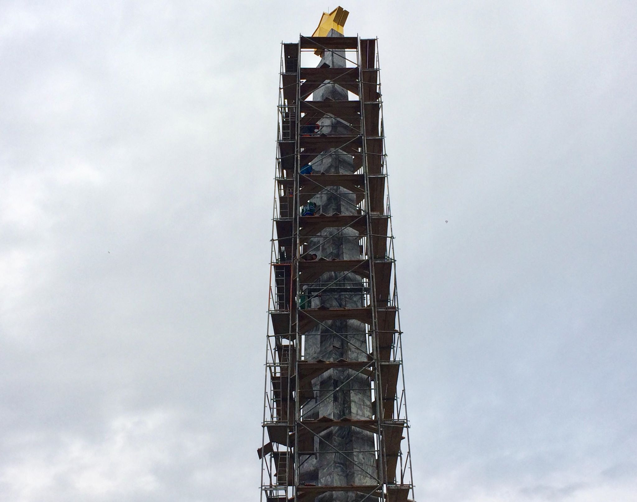 Сегодня рабочие заканчивают установку строительных лесов вокруг обелиска. Далее, после всех подготовительных работ, строители приступят к демонтажу облицовочных плит и удалению слоя штукатурки. После этого рабочие займутся восстановлением облицовки.