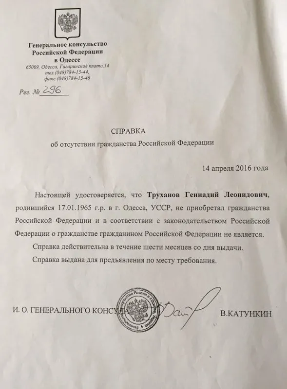 В 2016 году Труханов опубликовал справку из российского консульства, где говорилось, что он не имеет гражданства РФ. Он также ссылался на позицию украинской Миграционной службы, которая не получала официальных данных о выходе Труханова из гражданства Украины — а значит, никаких оснований для его лишения нет.