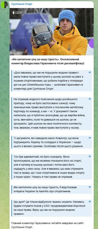«До сих пор считаю, что мы не нарушили никаких правил и имели полное право выступать в этом шлеме наравне с другими спортсменами, которые делали подобное в предыдущие дни на этих Олимпийских играх», — отметил украинский спортсмен.