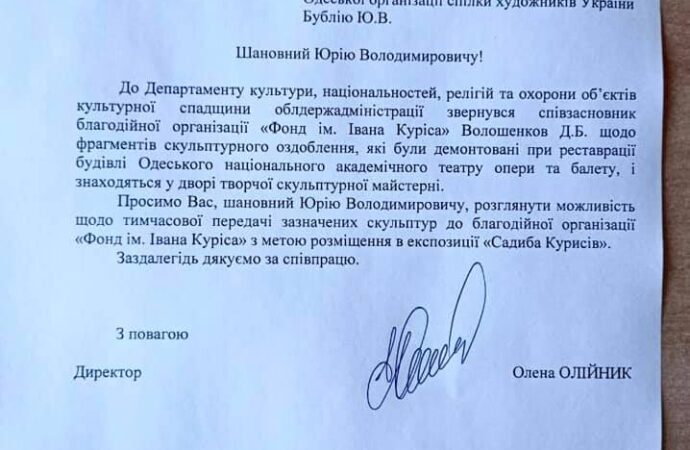 — Появилась информация о том, что на выезде из города был замечен эвакуатор с фрагментами скульптур, некогда украшавшими верхнюю часть здания Одесского академического театра оперы и балета… В конце 90-х годов, в связи с катастрофическим состоянием нашего Оперного театра было принято решение о капитальном ремонте, который планировали закончить через 4 года. Однако из-за традиционного недостатка средств, реконструкция затянулась на 11 лет и окончилась лишь в 2007 году. В результате были проведены масштабные работы, а также принято решение заменить уже изрядно пострадавшие от времени фигуры, украшавшие верхний ярус здания, на пластиковые копии для облегчения общей нагрузки на фундамент… В 2014 году мы основали «Фонд им.И.Куриса», основной целью деятельности которого является возвращение к жизни, уничтоженной пожаром в 1990 году и добитой впоследствии народным варварством, уникальной архитектурной жемчужины Северного Причерноморья — Усадьбы Курисов. Основная идея — превращение этого памятника архитектуры, построенного 200 лет назад «правителем дел генералиссимуса А.В.Суворова по секретной части» Иваном Онуфриевичем Курисом, в центр семейного эко-туризма… Мы и задумали вернуть вторую жизнь останкам фигур, демонтированных с одесского Оперного театра.