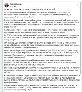 Экс-вицемер Одессы Дмитрий Жеман у себя на странице сообщил, что КП «Одесгорэлектротранс» оказалось в затруднительном положении. Ведь предприятие перешло на поставку электроэнергии от поставщика последней надежды (ПОН).