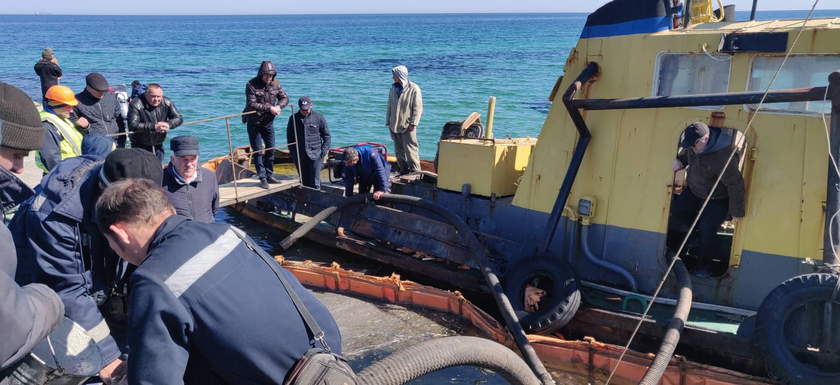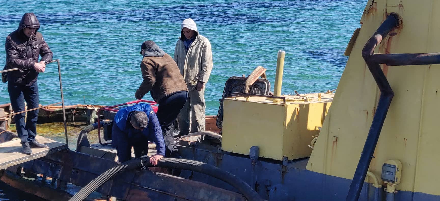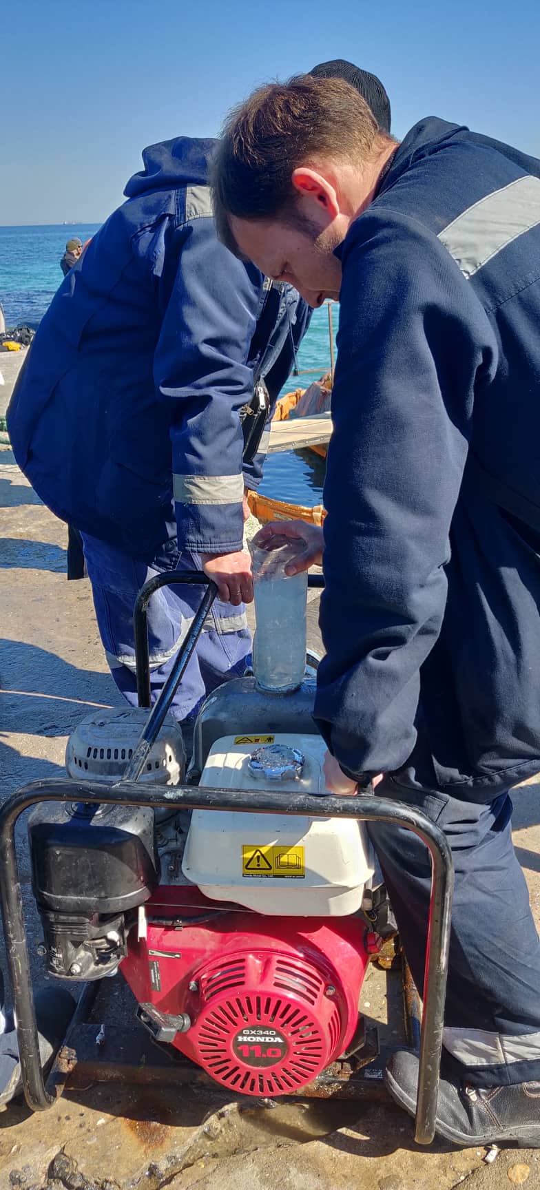 Работы проводят специалисты Одесского морского торгового порта. Вчера прошли подготовительные работы, сегодня приступили к откачиванию воды. Работы проводят двумя помпами – с кормы и из трюма. Однако одна из них остановилась, и рабочим никак не удается ее запустить.