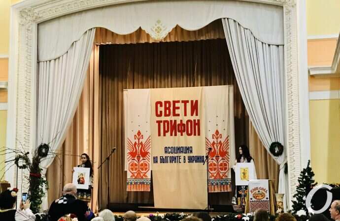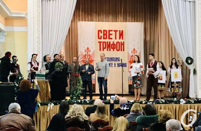Болгары, живущие в больших городах также не забывают этот праздник. В Одессе, в Болгарском культурном центре уже стало доброй традицией каждый год устраивать праздник с символической подрезкой лозы. И этот год, несмотря ни на что не стал исключением. На сцене – почетные гости, виноделы и старейшины общины, среди которых и генеральный консул РБ в Одессе Светослав Иванов.
