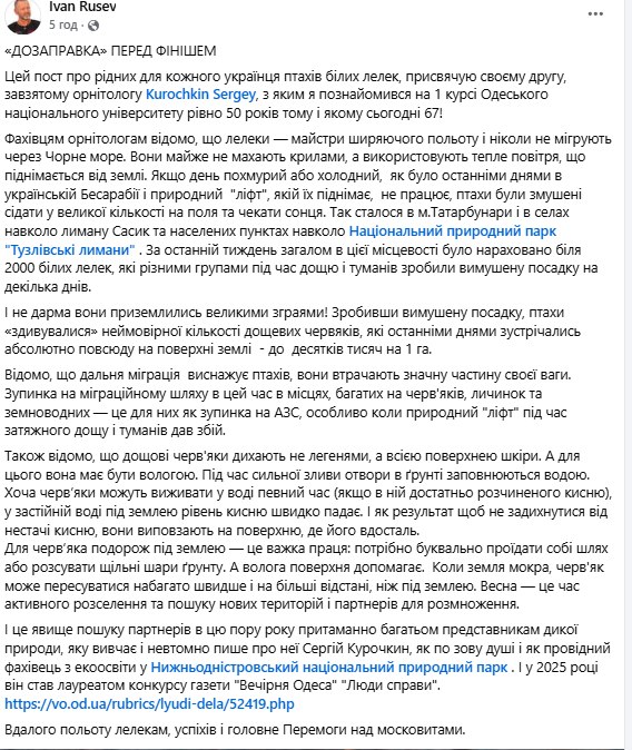 Эколог Иван Русев рассказал в социальных сетях, что в районе города Татарбунары, вокруг лимана Сасык и населенных пунктов вдоль Национального природного парка «Тузловские лиманы» в последнее время фиксируют около 2000 белых аистов. Птицы совершили вынужденную посадку из-за затяжных дождей и туманов.