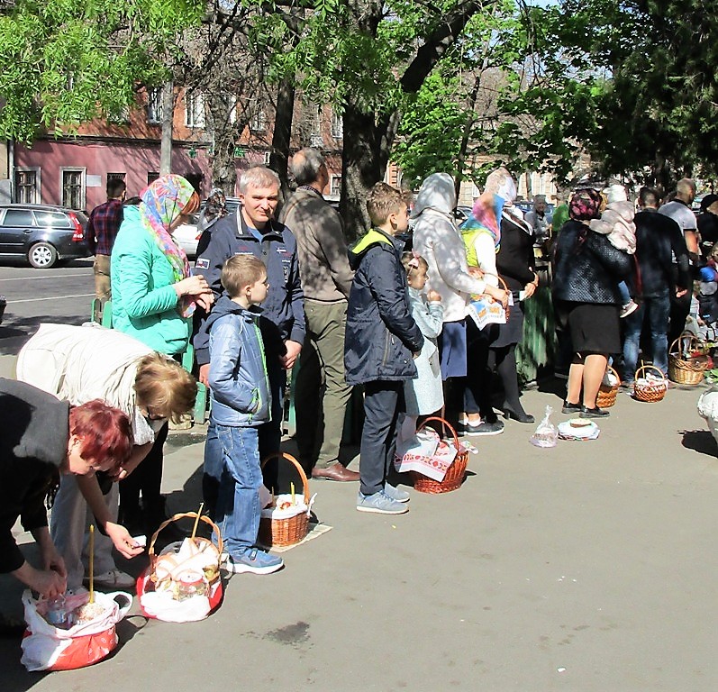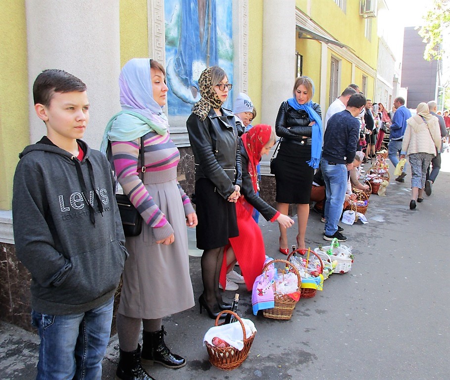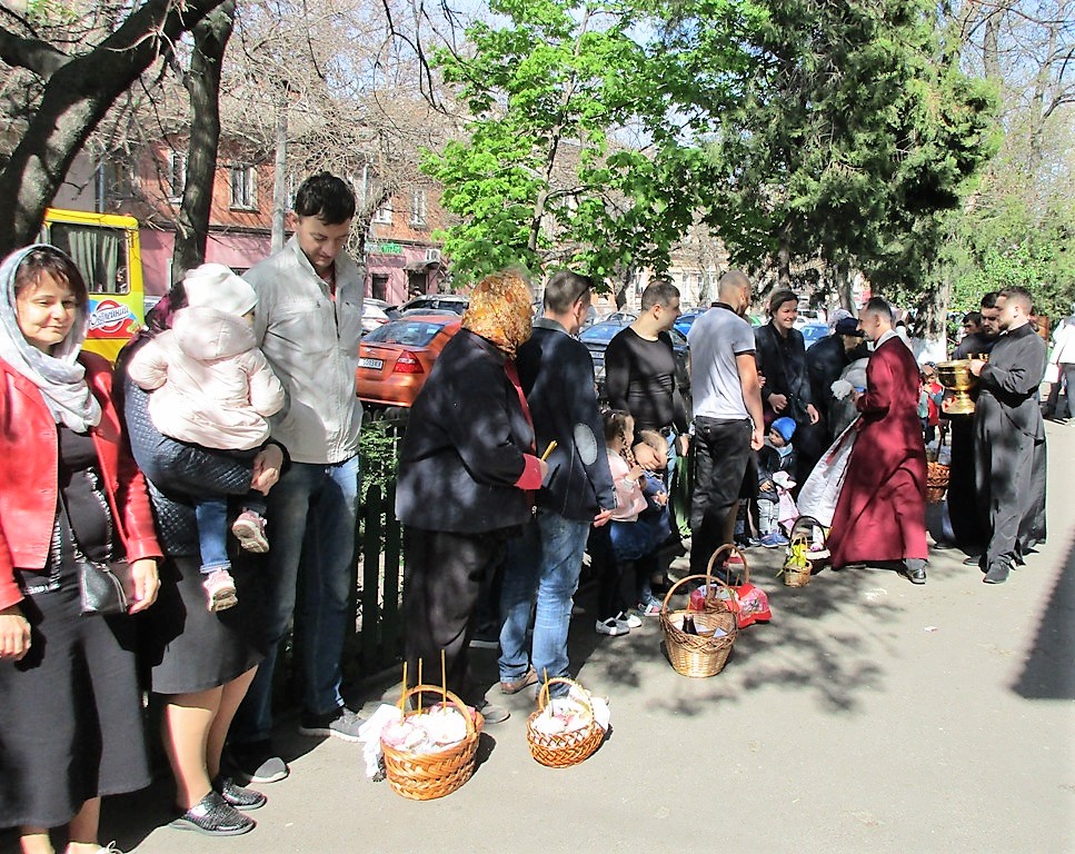 Храм Рождества Христова на ул. Пастера всех желающих освятить пасхальные корзины не вмещает: освящение происходит на улице. Люди сначала входят в храм, покупают свечи, потом выстраиваются в очередь. Как только происходит освящение, их места занимают другие. И несмотря на то, что уже далеко не ранее утро, сюда продолжают спешить сотни и сотни одесситов.