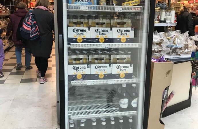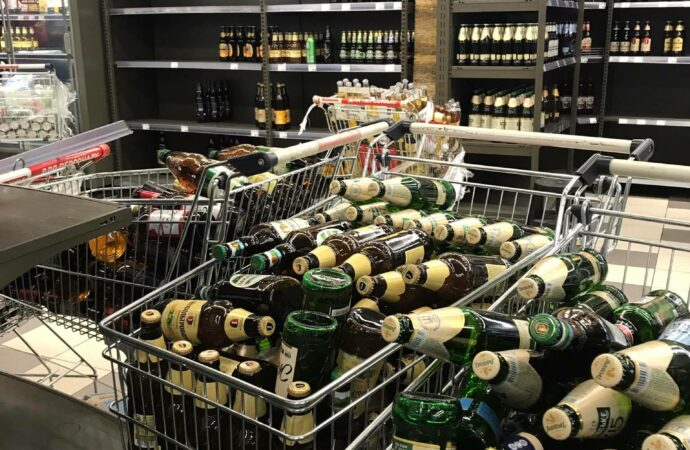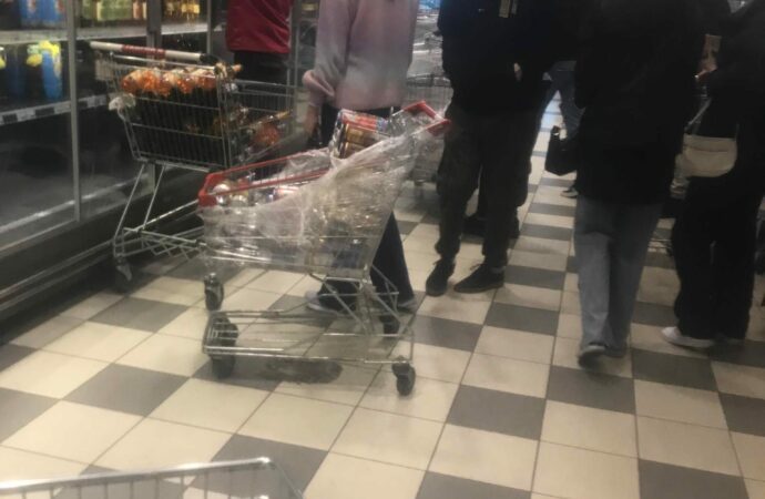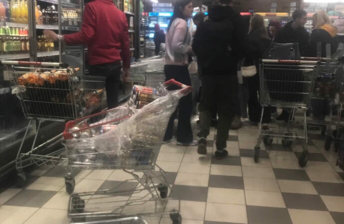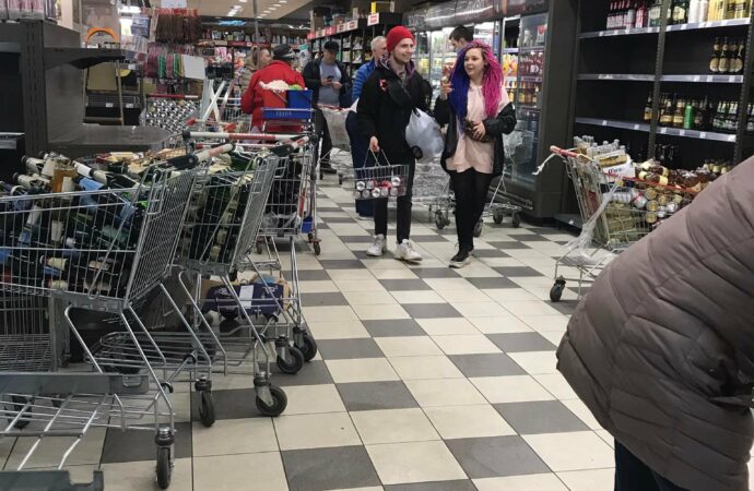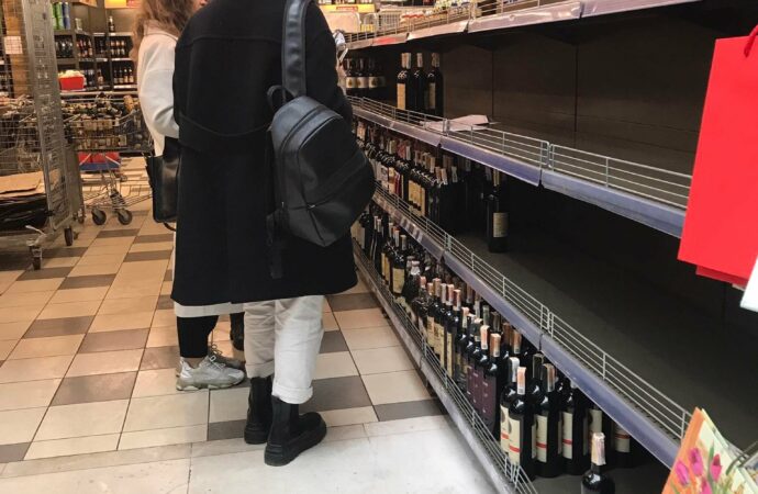 Спрос на пиво и вино разве что не ажиотажный. Полки, где выставлен ассортимент алкоголя уже наполовину пусты и перед ними периодически возникают небольшие очереди.