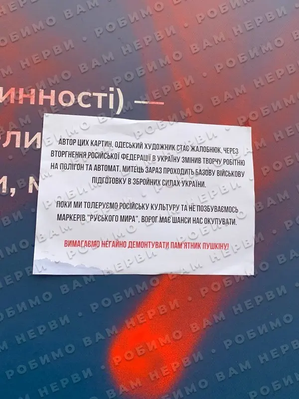 В Одессе активисты общественной организации «Робимо вам нерви» «обновили» защитный саркофаг, за которым недавно скрыли памятник Пушкину на Биржевой площади. Куб обклеили листовками с изображениями картин ныне мобилизованного одесского художника Станислава Жалобнюка.