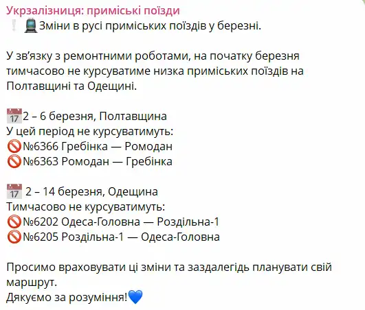 Также временные изменения коснутся и других регионов. В Полтавская область со 2 по 6 марта приостановят движение пригородных поездов №6366 Гребенка — Ромодан и №6363 Ромодан — Гребенка.