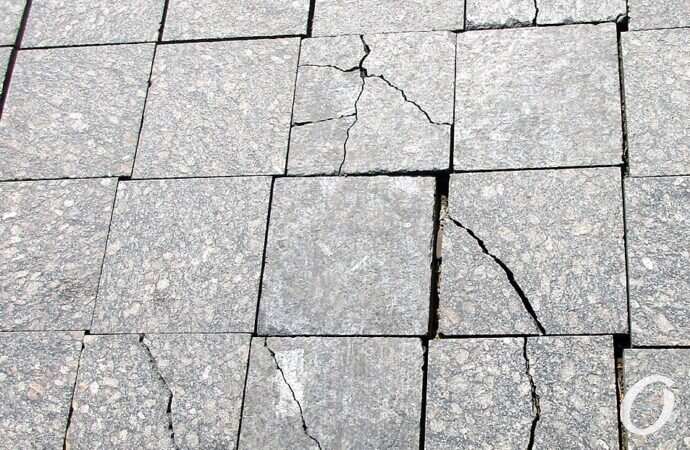 Плитка в некоторых местах так и «ходит» под ногами. Во многих местах — трещины и сломы, «стыки» разошлись.
