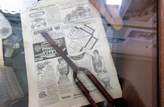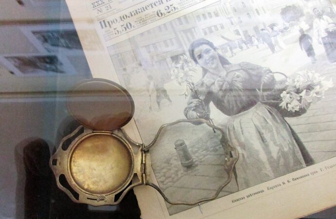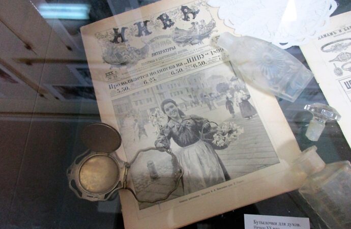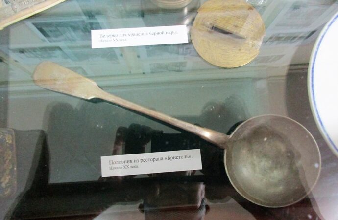 Ах, эти, казалось бы, уже ненужные вещицы… Сколько тайн хранят они! Сколько всего видели-перевидели, и словно ждали своего часа. Дождались. И вот перед вами сегодняшние диковинные сокровища (вчерашние привычные «бытовые штучки») — половник из ресторана «Бристоль», ведерко для хранения черной икры, пивная бутылка, бутылка от коньяка «Шустов», та же чернильница, плечики для одежды, окуляр от микроскопа, один рубль 1898 года… И все это — на фоне страниц из старых газеты и журналов