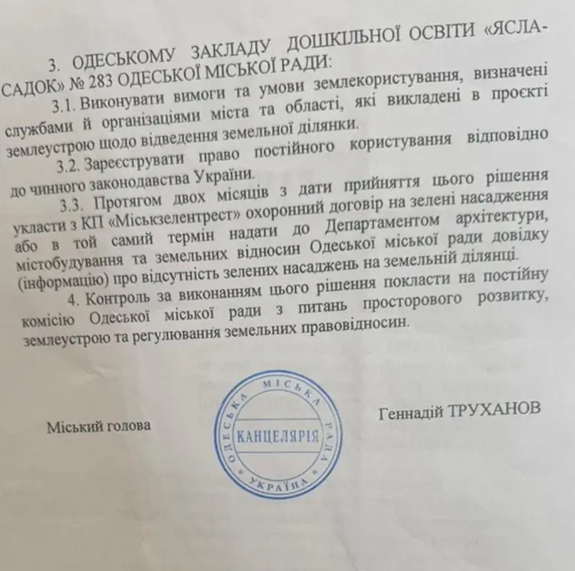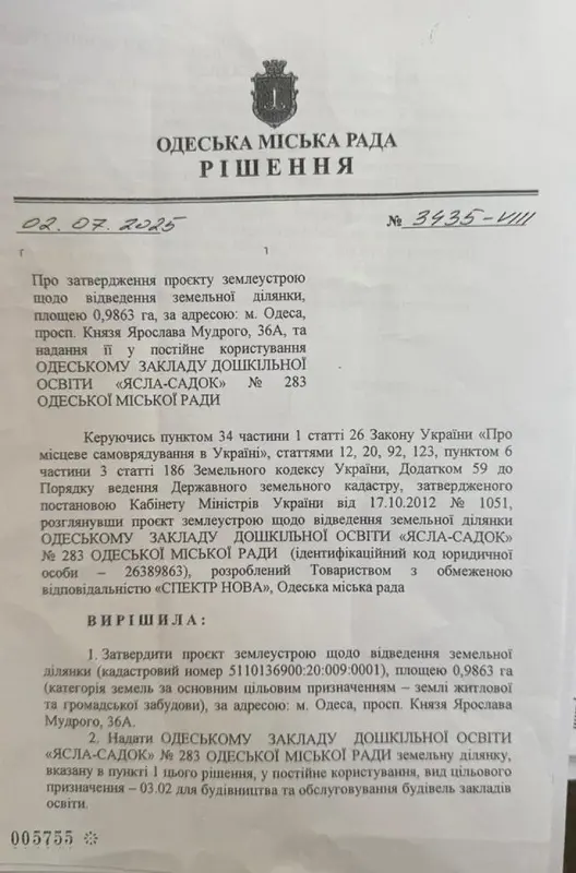 «В июле 25-го года эти документы были готовы. Прилагаю решение сессии городского совета и копию выписки из государственной регистрации от августа 2025 года. Обратите внимание на то, кто является правопользователем участка: САДОЧОК 283.