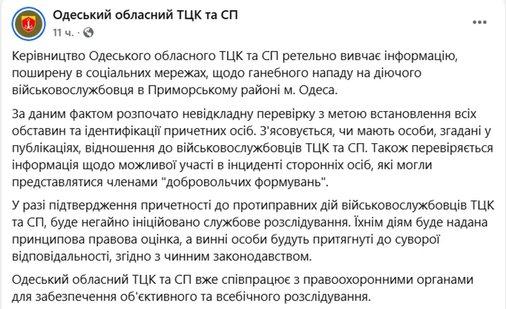 «В случае подтверждения причастности к противоправным действиям военнослужащих ТЦК и СП, будет немедленно инициировано служебное расследование», — говорится в официальном заявлении.