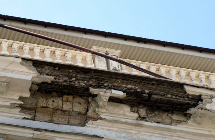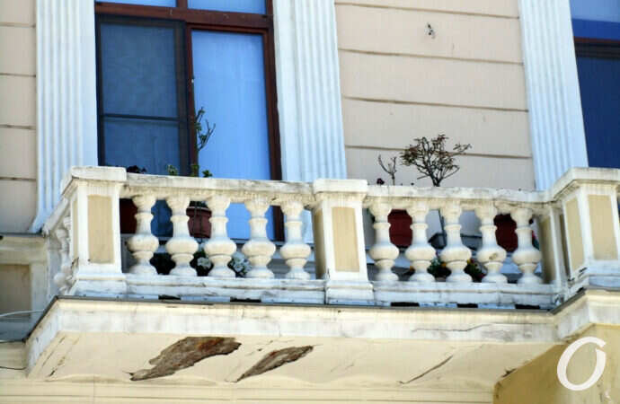 Никто не пострадал, обрушившиеся элементы уже убраны, а ограждение осталось: к фасаду по-прежнему подходить опасно. Об этом свидетельствуют и «дыры», образовавшиеся на месте «гроха», и другие опасные места фасада старейшего и красивейшего дома. Проблемы «красуются» и со стороны Приморского бульвара, и со стороны Воронцовского переулка.