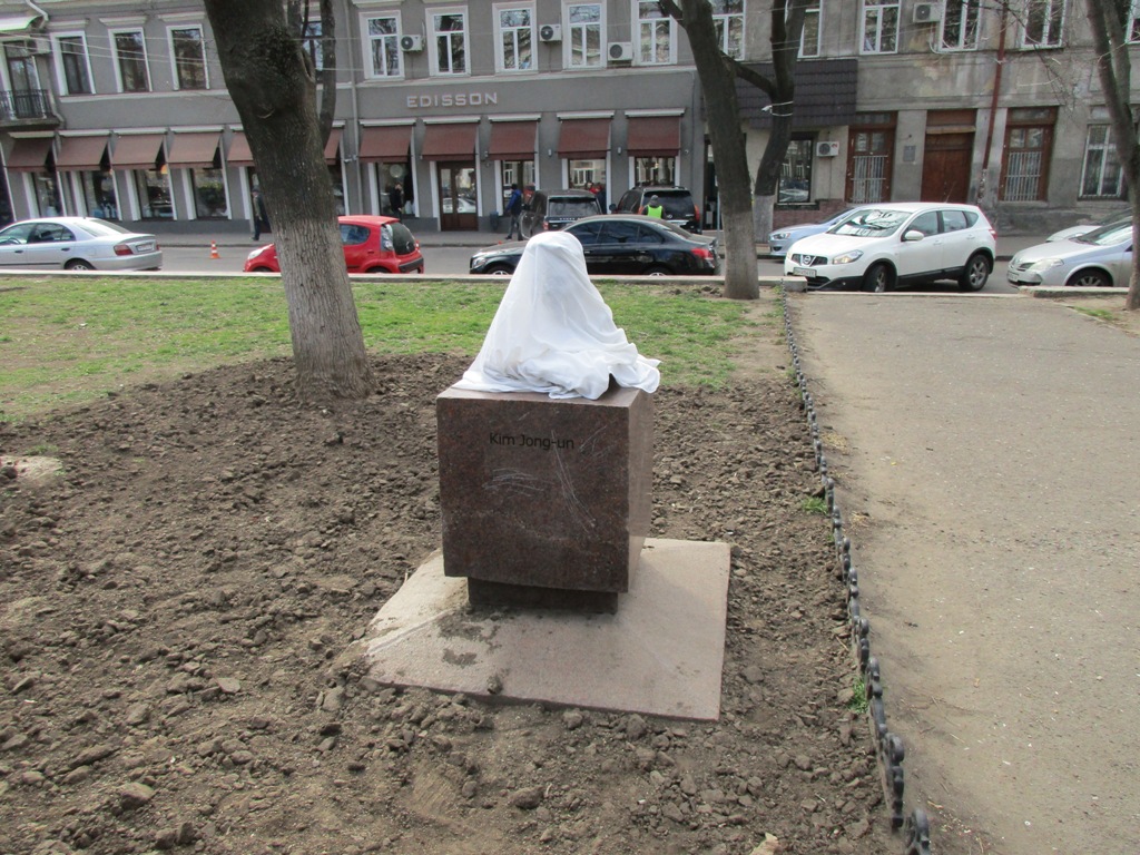 Тихий проспект сегодня днем превратился в нечто. Судите сами: подъезжают люди с сумками, потом достаются два бюста — Трампа «под золото»т и Ким Чен Ын «под серебро». Оба бюста уже имеют свои мини-подставки на колесиках. Оба политических деятеля современности устанавливаются на приспособленные постаменты, закрываются белым полотном, дополняет картину красная ленточка рядом. Автор обеих скульптур — Полина Вербицкая.