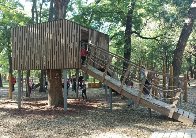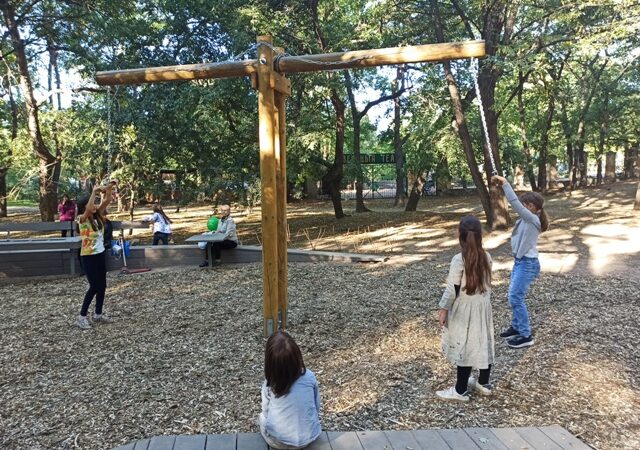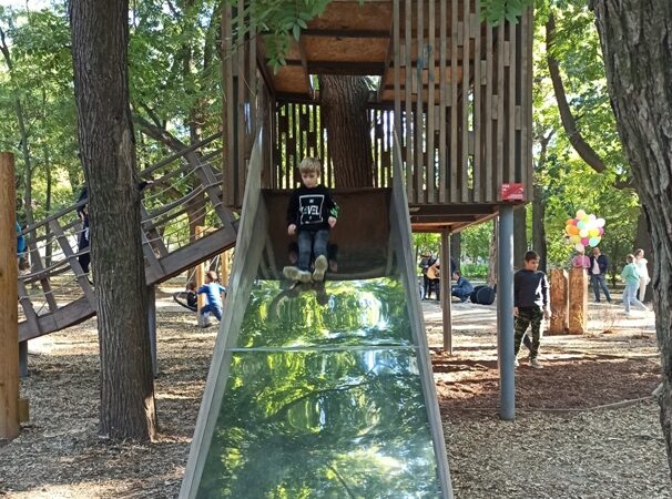Тут есть тарзанки, горка, нестандартные качели и даже ящик для раздельного сбора мусора — все это смотрится очень органично на фоне деревьев.