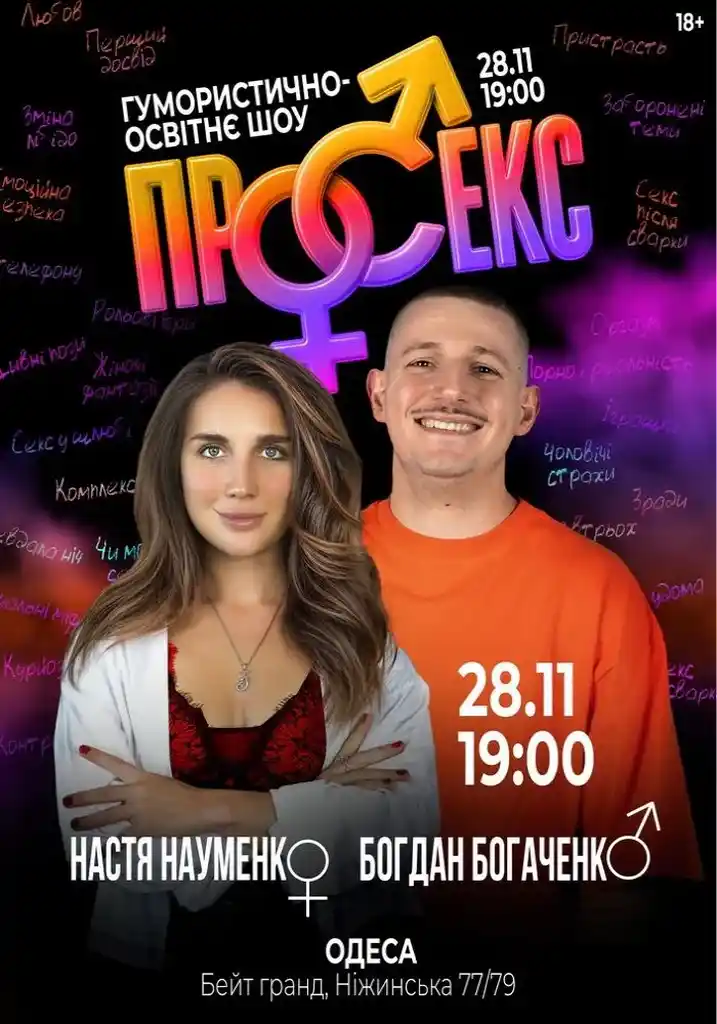 Смелое и остроумное шоу «ПРО СЕКС». Комик Богдан Богаченко и сексолог Настя Науменко отвечают на самые откровенные вопросы зрителей легко, профессионально и без лишних табу.