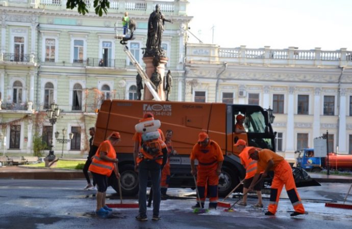 Кроме памятников сотрудники и техника коммунальных предприятий «Городские дороги», «Сервисный центр», ЖКС «Порто-Франковский» убрали тротуары и улицы в зоне пешеходного центра Одессы.