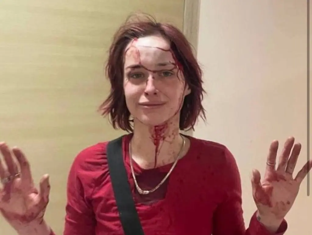После того как парня повезли в ТЦК, а девушка начала снимать на телефон отъезжающий автобус и водителя, военный с костылем выбежал из отделения полиции и несколько раз ударил им девушку по туловищу, а затем – по голове.