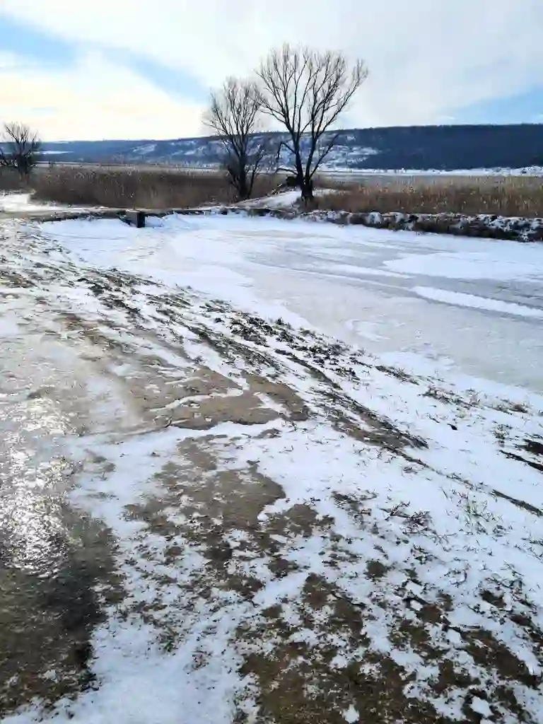Кроме того, с южной стороны реки обустроена насыпь, которая фактически перекрывает русло и используется для проезда транспорта. В конструкции смонтирован примитивный водоперелив из бетонных плит, через который осуществляется сток воды.
