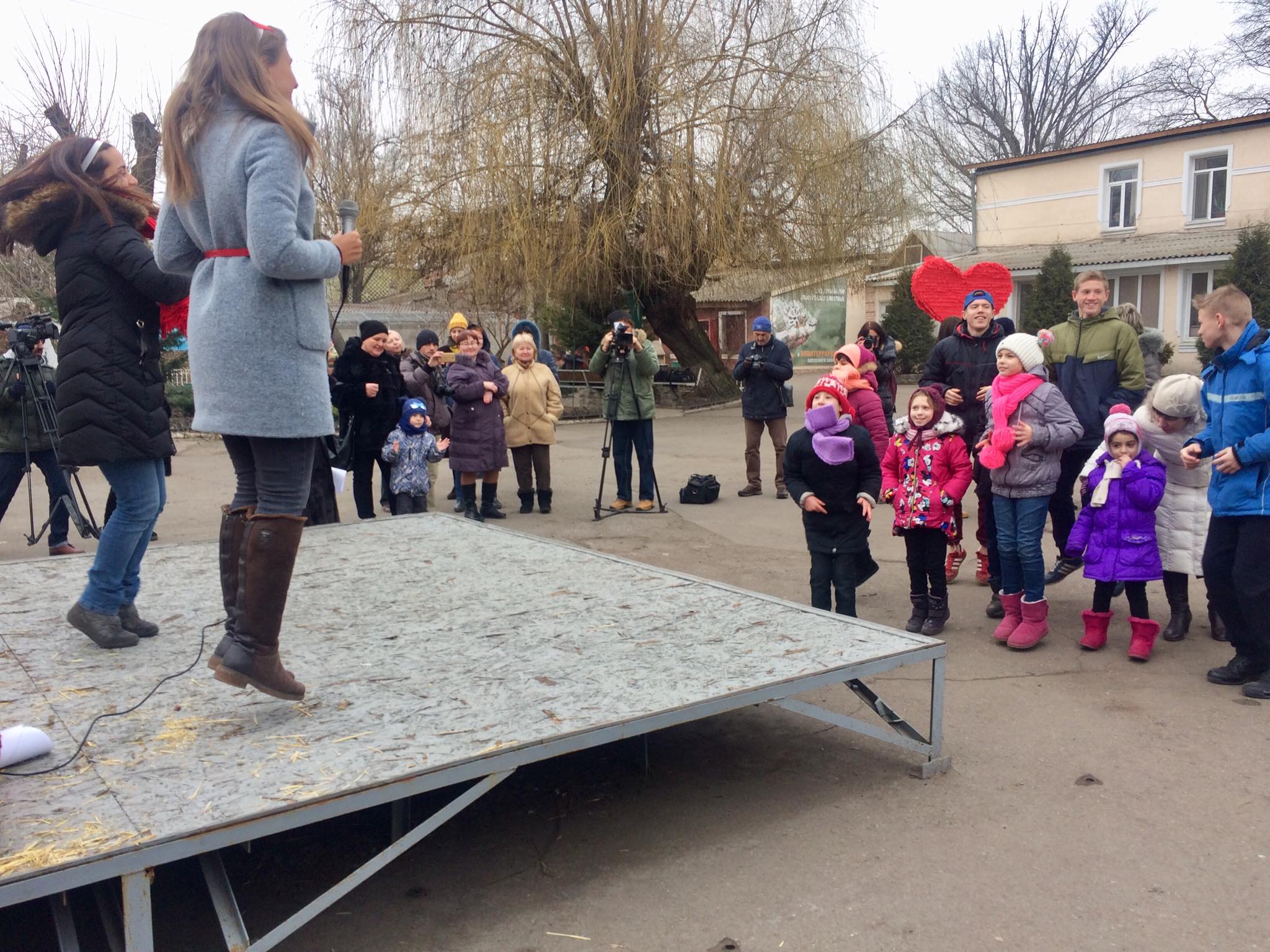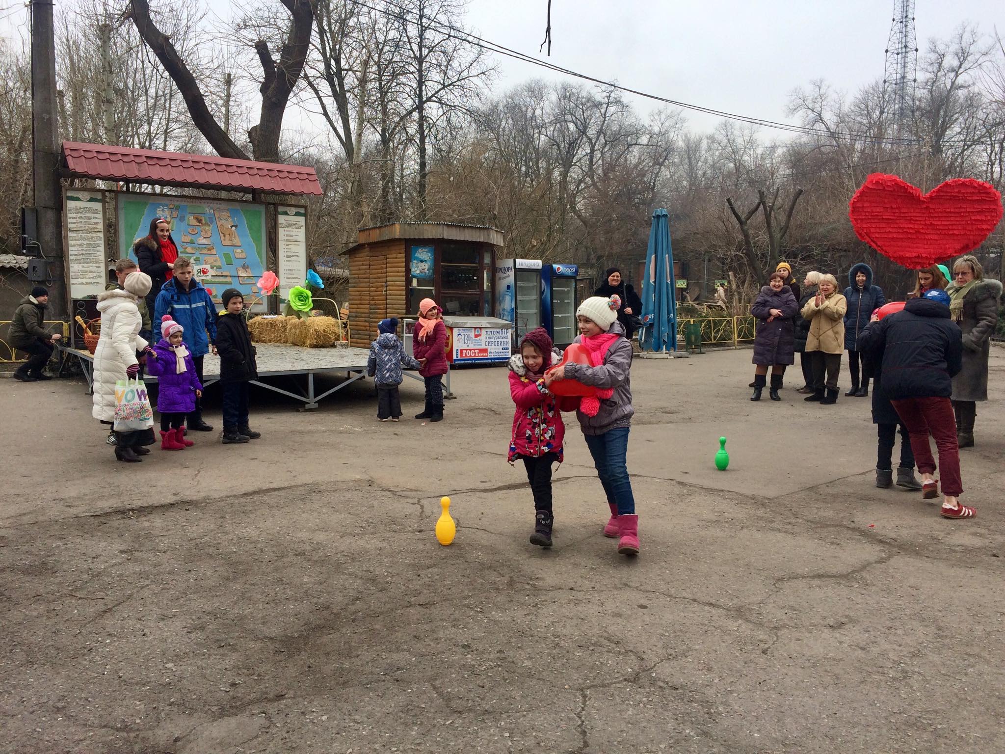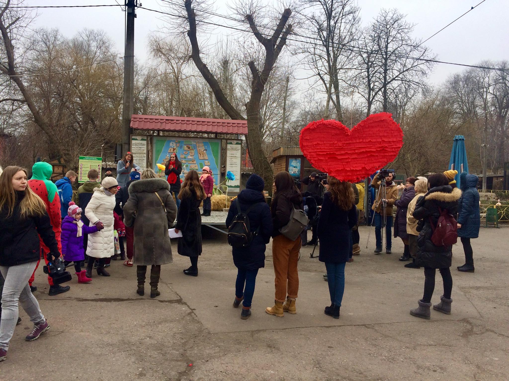На День святого Валентина в Одесский зоопарк пришли дети и влюблённые. Для юных гостей здесь подготовили активную программу развлечений и конкурсов с призами. Среди прочих конкурсов был и совершенно соответствующий сегодняшнему празднику: нужно было в паре пронести воздушный шар в виде сердца, да так, чтобы оно — сердце — не упало и не разбилось.