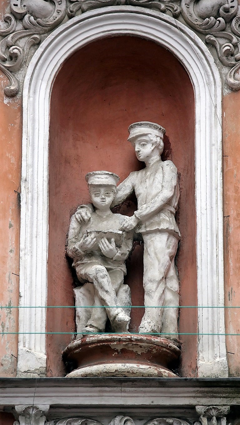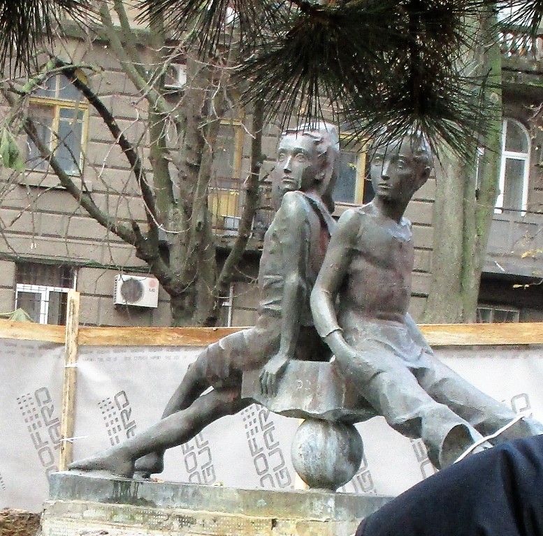 Скульптуры, установленные здесь, — это вовсе не античные боги, не герои мифов. Это — обычные люди, одесситы из раньшего времени. Внизу — человек, профессию которого определить не так-то и просто. Одни краеведы говорят, что это рабочий, другие называют его ученым, учителем и даже литератором. Выше — скульптура крестьянина. А вот «эти двое», которые занимают самую верхнюю нишу — и есть наши герои. То ли два гимназиста, то ли гимназист (сидит) и студент (стоит).
