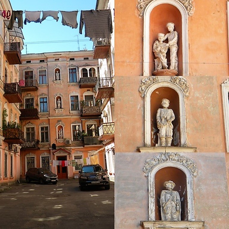 Вы, вероятно, и сами не раз замечали: во многих дворах в исторической части города встречаются ниши. Пустующие. Оказывается, обычно в этих нишах когда-то были скульптуры — самые разные, теперь, увы, уже за редким исключением, и не установишь, какие именно. Скульптуры исчезли, ниши остались, словно задали всем нам неразрешимую загадку… А вот один старый одесский двор на ул. Нежинской по счастливой случайности сохранил в своих нишах три скульптуры. И ими можно полюбоваться.