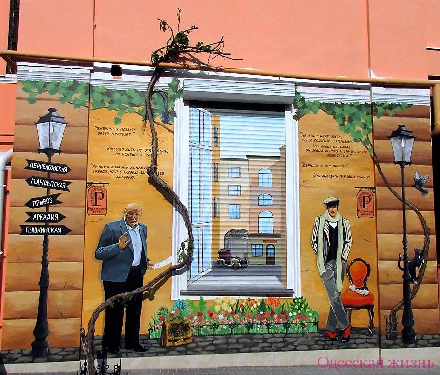 Переулок Маяковского славится теперь не только «домом трезвеников» (именно с одним «н»), о котором сообщала «Одесская жизнь», и не только «возрожденной» после кражи Кошкой-геймером. В одном из старых дворов переулка появился чисто одесский стрит-арт, объединивший Михаила Жванецкого и Остапа Бендера.
