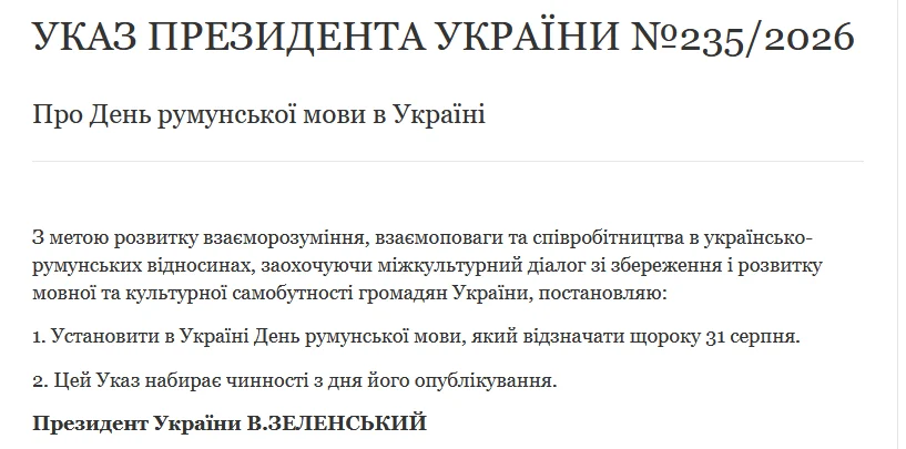 В Украине официально появится новый праздник — День румынского языка. Соответствующий указ №235/2026 подписал Владимир Зеленский 12 марта 2026 года.