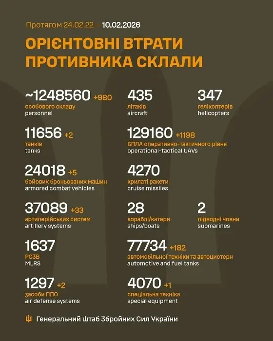 Сегодня, во вторник, 10 февраля 2026 года, начался 1448-й день широкомасштабной вооруженной агрессии РФ против Украины. За прошедшие сутки Россия продолжила массированные атаки ударными беспилотниками по регионам страны, есть пострадавшие среди мирного населения. На фронте фиксируются локальные изменения линии соприкосновения, а Генштаб ВСУ сообщает о значительных потерях российских войск. Тем временем решение Международного олимпийского комитета запретить украинскому спортсмену чтить память погибших атлетов вызвало широкий резонанс…