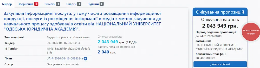 Национальный университет «Одесская юридическая академия» планирует потратить более 2 миллионов гривен на рекламные и информационные услуги. Соответствующая информация опубликована на портале Prozorro.Закупівлі.