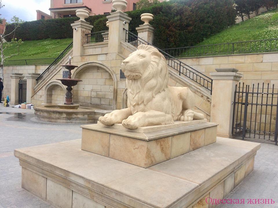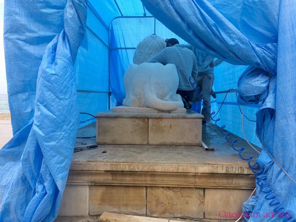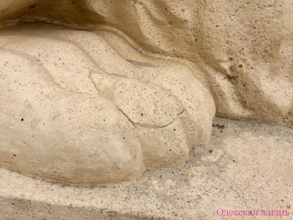 Корреспондент «Одесской жизни», побывав на месте, выяснил, что каменная фигура царя зверей покрылась трещинами, также пострадала облицовка постамента. Поэтому была начата реставрация.