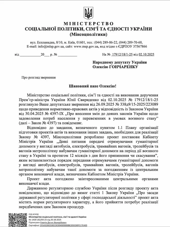 Хотя закон принят, Одесса до сих пор ждет, когда автобусы, подаренные городами-партнерами, наконец начнут возить пассажиров. Транспорт по-прежнему стоит в депо из-за бюрократических задержек.