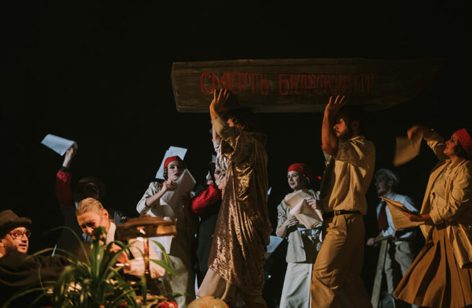 Смеясь, человечество расстается со своим прошлым. “Золотой теленок” Голенко дает снова почувствовала счастье иметь такую способность и возможность. И речь идет не только о событиях столетней давности. Мы можем позволить себе смеяться и над прошлым, и не боимся смеяться над собой сегодняшним, смотреть на себя с разных проекций, критиковать. или, наоборот, становиться счастливыми и свободными. Главное, не остаться «непугаными идиотами». За это начали бороться еще Ильф и Петров, когда их роман подвергался цензуре и запрещался, это право продолжаем отстаивать мы — сегодняшние. А не растерять эту нашу «суперспособность» как раз и помогает Голенко.