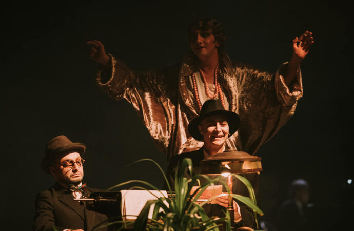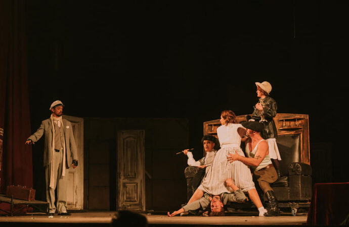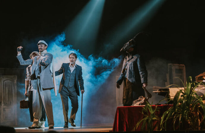 До последней минуты сложно распознать под маской, кто играет безумного водителя адской машины “Антилопы” Адама Козлевича (Анатолий Головань) , да и Ирину Охотниченко роли Полыхаева узнать не просто. В постановке вы увидите еще много неожиданных перевоплощений, которые вполне соответствуют заявленному Голенко жанру “авантюра”.