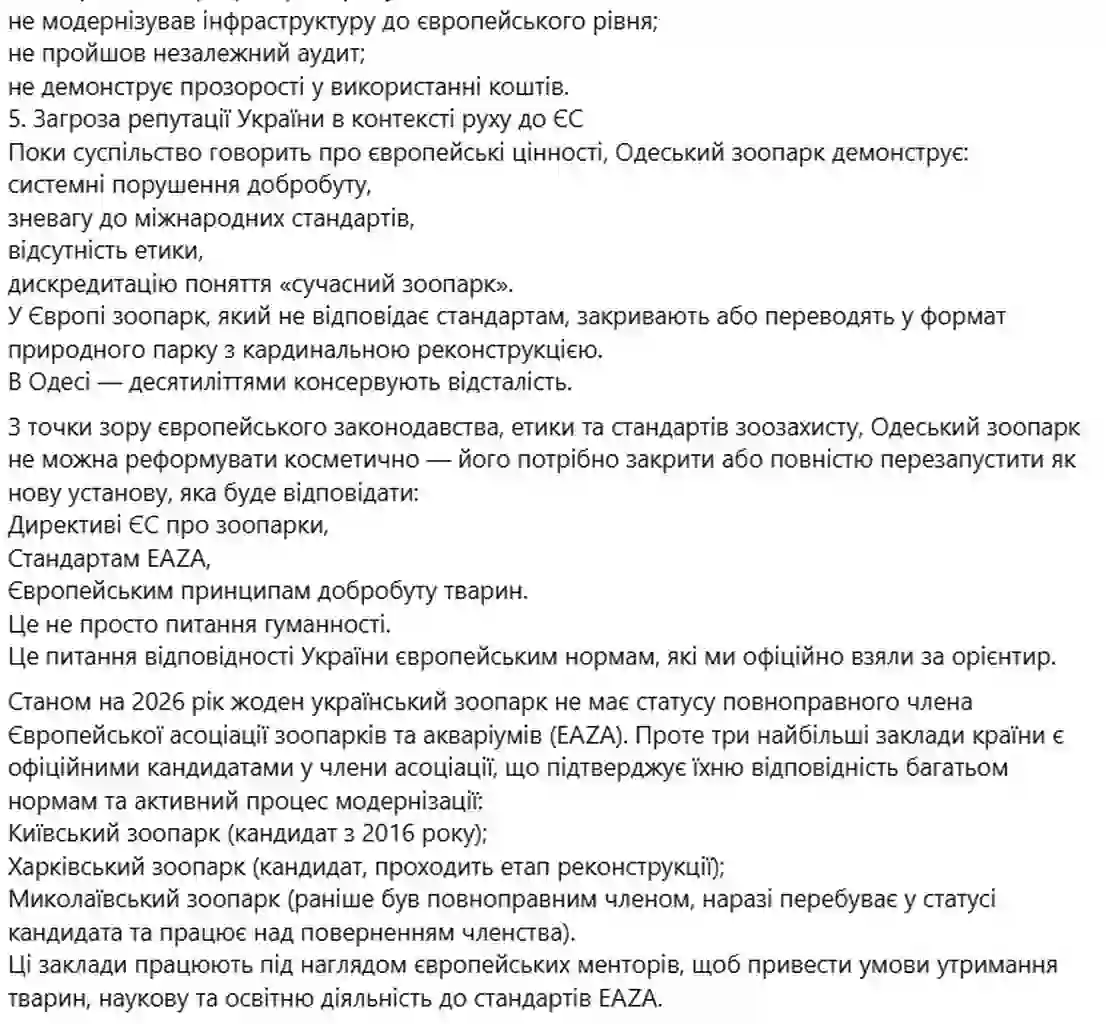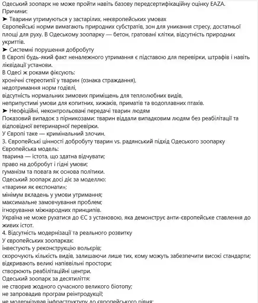 Отдельно в посте говорится о стандартах Европейской ассоциации зоопарков и аквариумов, которые считаются эталонными в Европе. По мнению активиста, Одесский зоопарк не способен пройти даже базовую предсертификационную оценку.