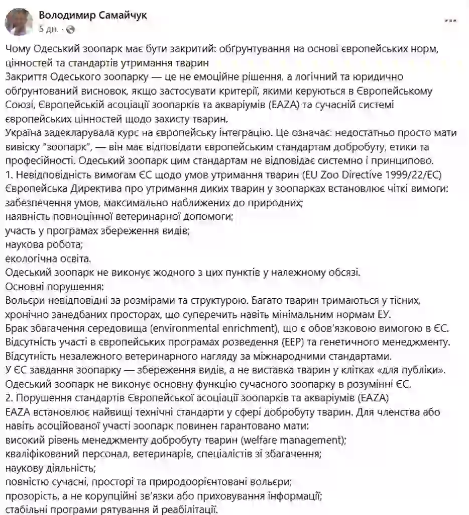 Общественный активист и зоозащитник Владимир Самайчук опубликовал в Facebook пост, в котором призвал к закрытию Одесского зоопарка. Свою позицию он аргументирует нормами европейского законодательства, стандартами EAZA и ценностями благополучия животных, которые являются базовыми для стран ЕС.