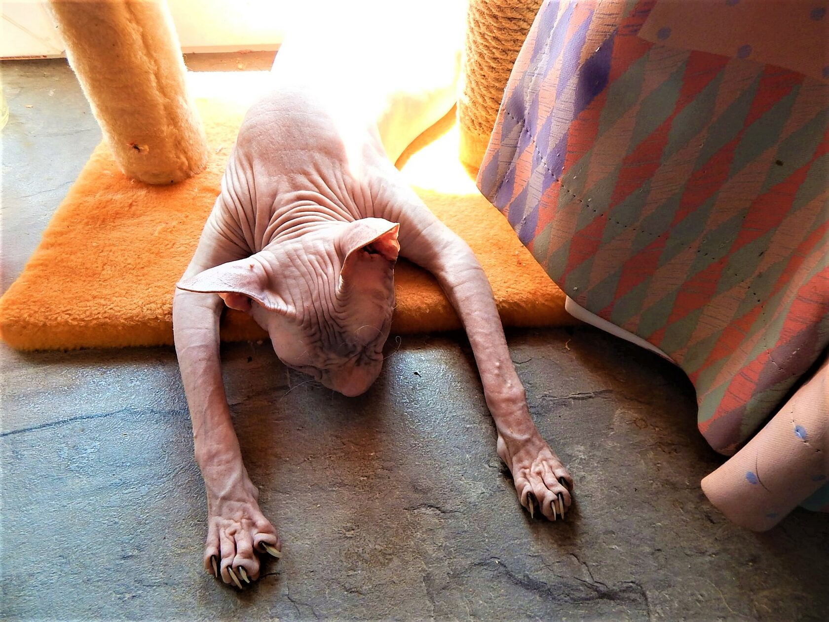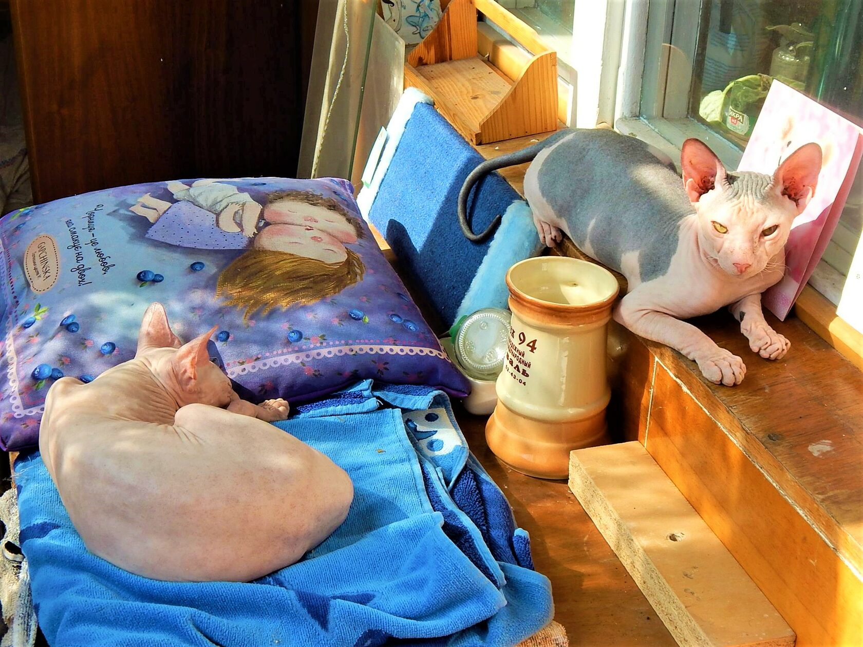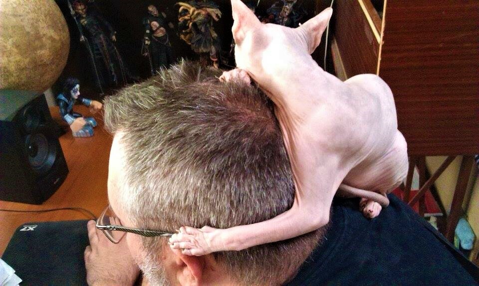 Як сфінкси ладнають з іншими членами сім’їУ сфінксів цікаве ставлення до інших домашніх тварин. Крім котів, у нас з дружиною живуть щурі та павук, але котики до них ставляться з невластивою хижакам гидливістю.А ось один до одного спочатку ревнували. Чакі була такою собі улюбленицею в родині, така добра кішка, радісна. Вона на той момент була доросла жінка, і тут принесли Марвіна, кошеня-підлітка.Чакі дивилася на нас з презирством, страхом та гнівом. Вона спеціально ніколи не дряпалася, максимум що могла подряпати плече, при спробі на нього вискочити. Але того разу заскочила на плече дружині і такого смачного ляпаса дала, за зраду. А потім мучила кошеня, і навіть пошкодила йому око, але все обійшлося. Кошеня підростало, виросло дорослим красивим котом, і Чакі скорилася, стала такою покірною дружиною. Спочатку Марвін їсть найсмачніше, потім вона доїдає.Кошенят, що народжувалися у Чакі і Марвіна, роздаровував знайомим безкоштовно, чим викликав невдоволення професійних розвідників. На спеціалізованих форумах з власниками породи контакти не підтримуємо, зате активно спілкуємося з тими сім’ями, кому віддали кошенят.Самі на особистих сторінках ведемо на Фейсбуці блог, де описуємо життя Чакі і Марвіна, їхні пригоди і побутові випадки з життя. Ну, і з господарями кошенят від Чакі і Марвіна обговорюємо різні ветеринарні проблеми.