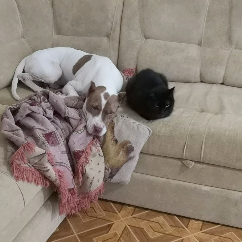 Прихистили тимчасово й більше не змогли відпустити«Тоді був місяць, як ми втратили свого собаку, горювали. У нас був молодий аргентинський дог, його не стало. Залишився лише кіт Вася. Тож вирішили допомогти тварині, бо охочих не було: порода специфічна, люди бояться пітбулів. В оголошенні йшлося про те, що собака стерилізований і чекає у клініці».Худий, у шрамах, без зуба, із заляканим поглядом – таким побачили молоді люди собаку у ветеринарці.Дізнались, що його звати Стеф, так принаймні було вказано у ветеринарному паспорті, який дивом уцілів. Виявилось, що псу на той час було 4 роки, важив він 19 кг (середня вага пітбулів – 25).«Нам було його дуже шкода, тож узяли на перетримку. А потім прикипіли. Одна з причин: ми не розуміли, як можна викинути собаку, як можна нею «заробляти» на холоді, не думати про її здоров’я, адже тварина мерзне, короткошерста. І взагалі, хто візьме дорослу собаку, крім нас? У нас не вийшло із догом, тож дали шанс собі і тварині, яка опинилась у біді».Так Стеф породи американський пітбультер’єр став жити в родині Мельдерів. Раніше, коли обирали свого попереднього собаку, то читали і про пітбулів, знали чимало про поведінку та особливості породи, тим паче у друзів є 2 пітбулі.Галина та Євген кажуть, що Стеф одразу став другом, кілька днів виходив зі стресу, сторожко до всього у квартирі прислухався. Любов Стеф став проявляти на третій день – лащитись, облизувати, перестав боятись.Із котом Василем спочатку не товаришували, тож тварин розділяли по різних кімнатах. Власники побачили, що Стеф насправді добрий, слухняний, однак турбувала зооагресія – він ніяк не міг гуляти поряд із іншими тваринами. Галина та Євген сказали про зооагресію волонтерам і отримали контакти кінологині.