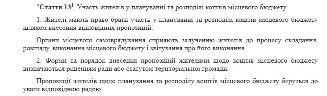 8 січня 2025 року набрали чинності зміни до Закону «Про місцеве самоврядування». У новій статті 13-1 йдеться: жителі мають право брати участь у плануванні та розподілі коштів місцевого бюджету, а органи місцевої влади повинні сприяти їх залученню.