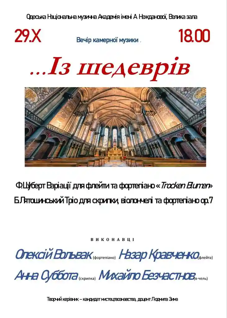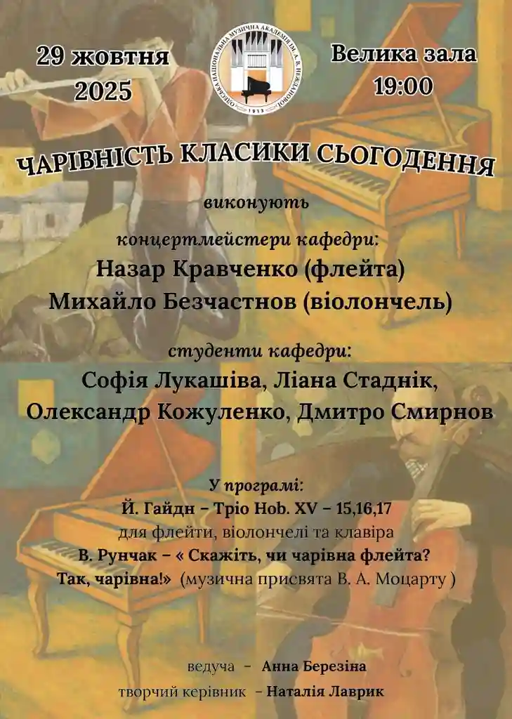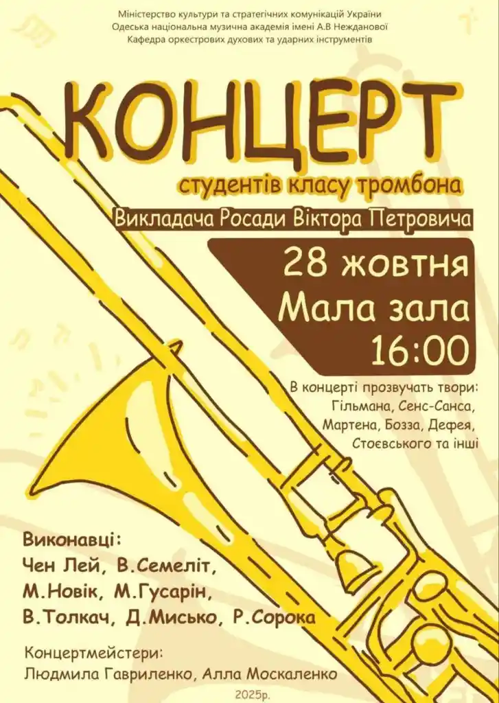 Музична академія на Новосельського запрошує одразу на кілька подій: концерт студентів класу тромбона, вечір камерної музики, програма «Із шедеврів» і концерт «Чарівність класики сьогодення». Тут молоді музиканти поділяться натхненням, відтворюючи звуки, що торкаються серця.