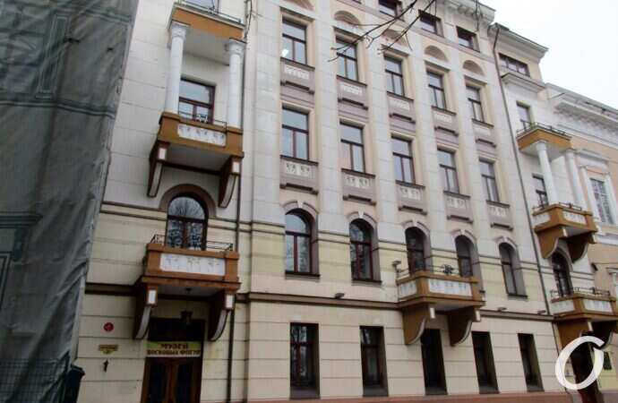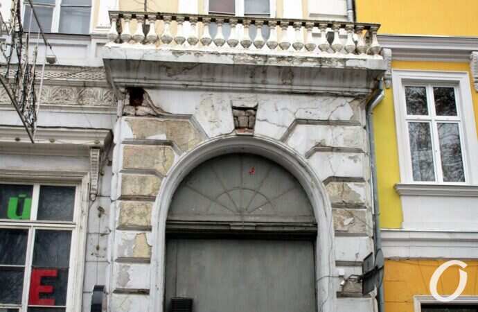 Цей будинок так давно задрапірований, що, здається, всі давно звикли до цього факту. Роки йдуть – змінюється лише драпірування. Про те, що будинок у моторошному стані, одеські ЗМІ повідомляли ще 15-16 років тому. Щодо цієї будівлі свого часу були суди (Одеська ОДА вимагала від власників будівлі провести належну консервацію будинку). Громадські люди турбувалися з приводу того, що тут може зрости новий ТЦ. Результат сьогодення – на фото. Будівля як би і є, але, як і раніше, задрапірована.