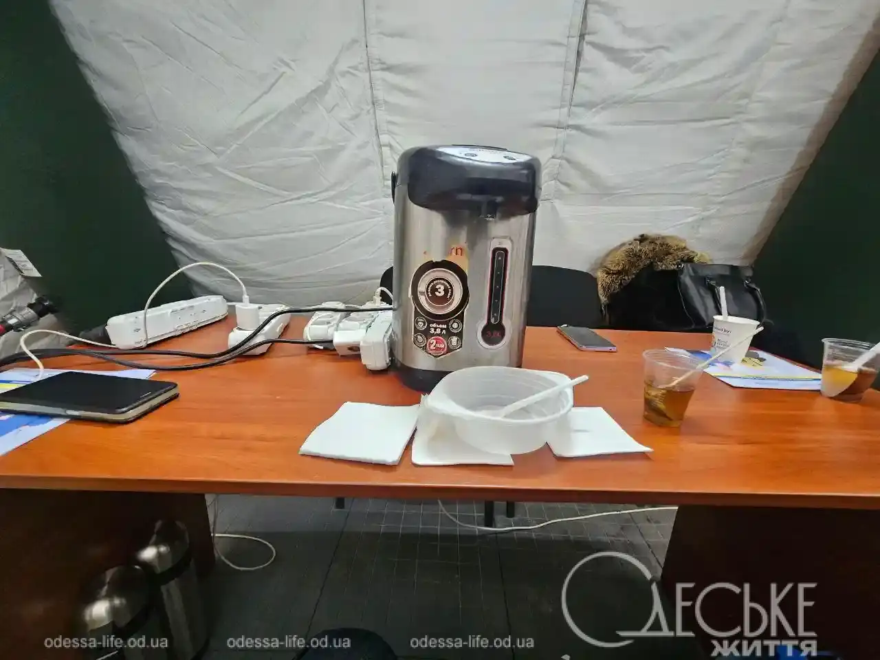 Репортерка «Одеського життя» відвідала один з таких пунктів ще вранці, але всередині вже були люди. Хтось сидів із телефоном біля розетки, хтось тримав у руках стакан гарячого чаю, хтось просто мовчки грівся.