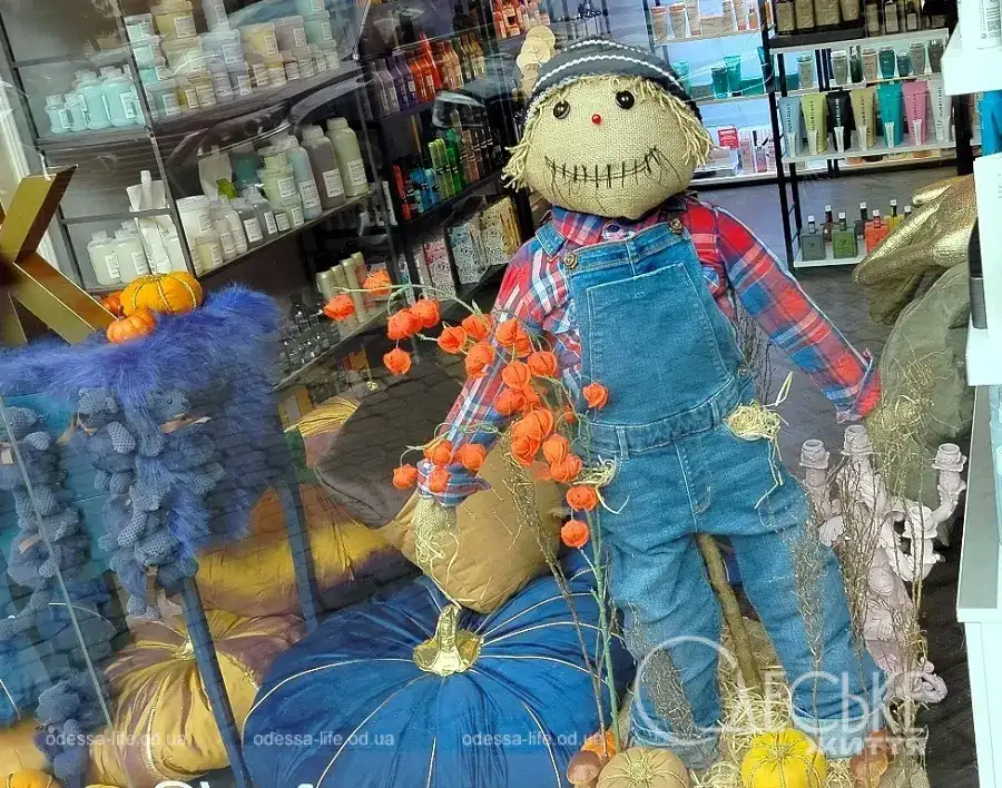 - Міські вітрини прикрашають гарбузи, солом’яні лякала та осінні композиції.